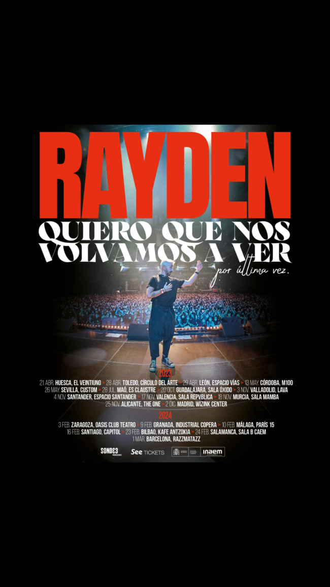 Rayden se encuentra despidiéndose por todo lo alto tras anunciar que dejará la música en 2024. Después de más de 20 años de carrera, seis discos y el nuevo lanzamiento del séptimo, 'La Victoria Imposible', el artista ha decidido parar su carrera. Pero dirá adiós encima del escenario con su gira 'QUIERO QUE NOS VOLVAMOS A VER POR ÚLTIMA VEZ', con la que recorrerá toda España y parte de Latinoamérica durante este año y el próximo.